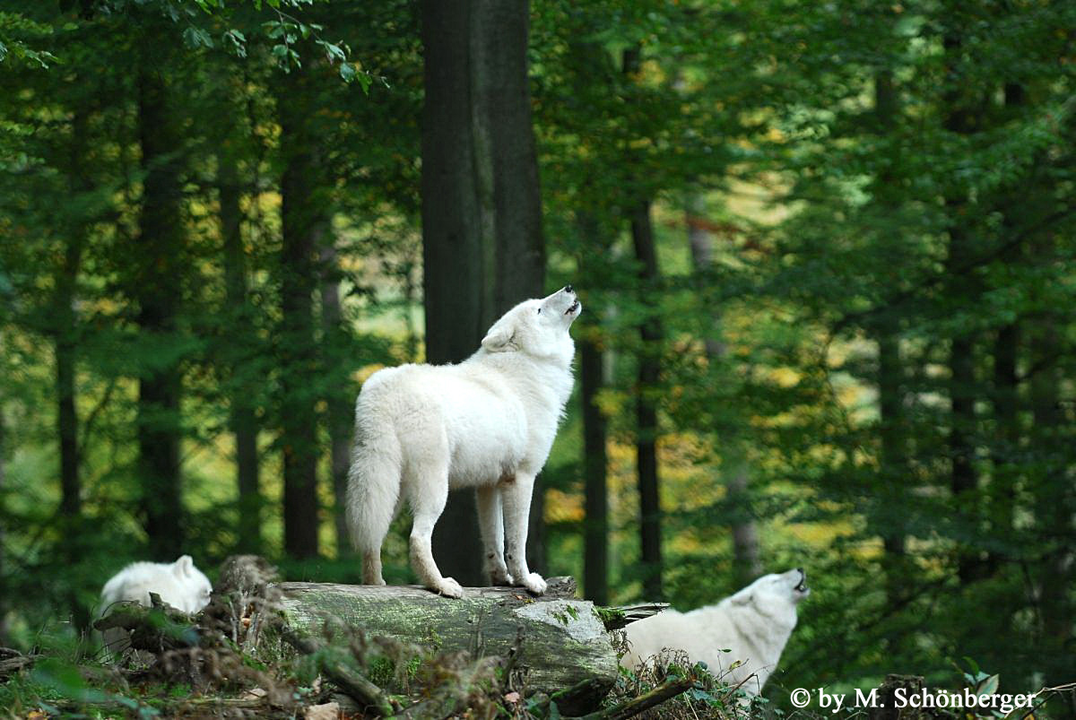 Beschreibung des Bildes: Die Alphawölfe halten sich bei Werner Freund auf. "Ellesmeer" leckt den Fang als Zeichen der Untertänigkeit. Der Omegawolf "Kleiner Mann" (links vorne) versteckt sich in derBaumstammgruppe und wird von Nanok in Schach gehalten.